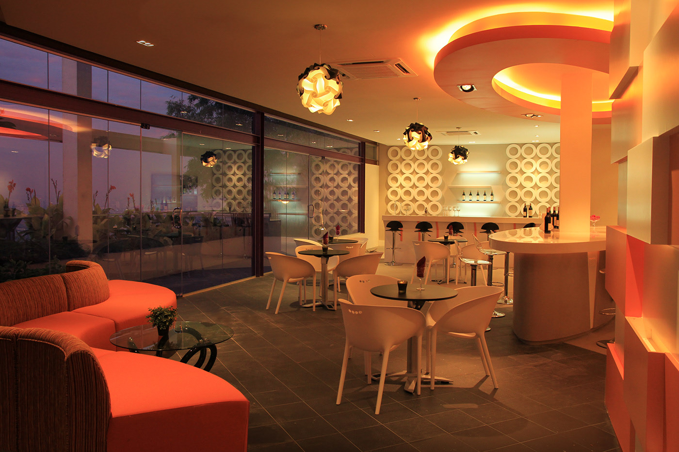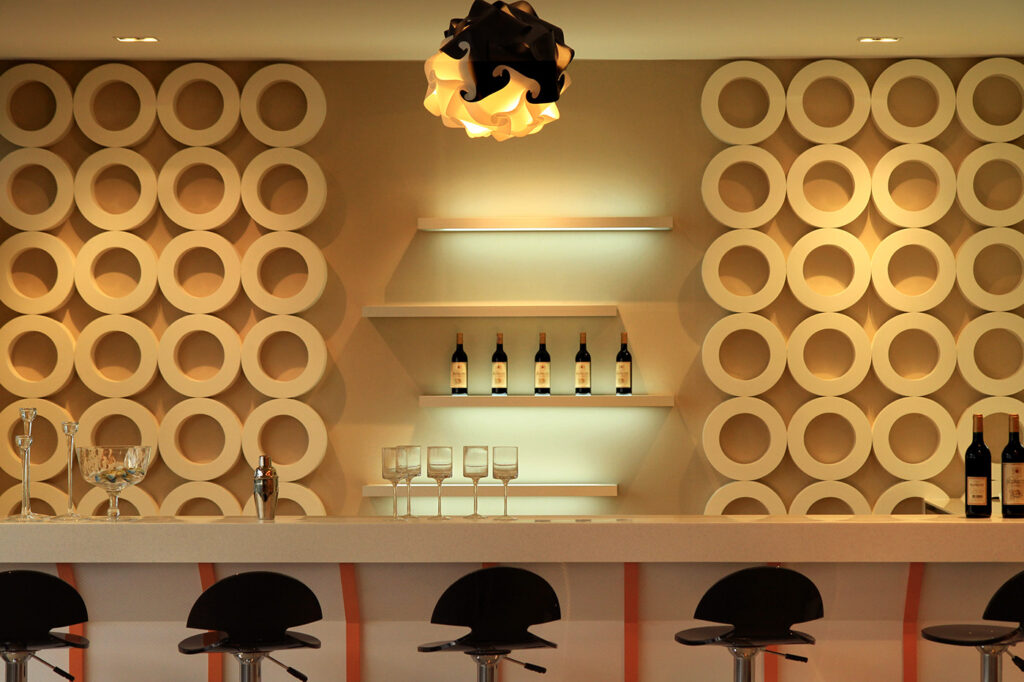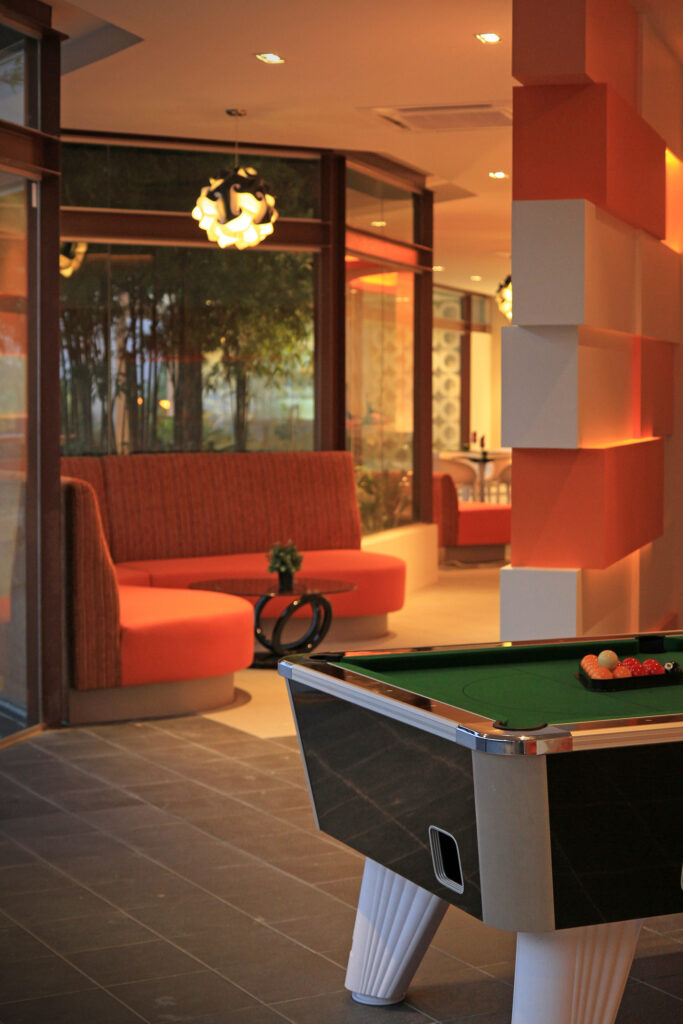 The café is designed with a friendly approach in mind. It has a warm color scheme and cozy interior that provides warmth to guests. It has been designed with a unique combination of natural materials, such as wood and stone, alongside colorful furniture that makes it more lively and creative.